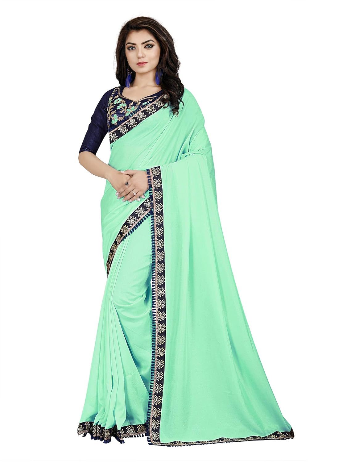 Navy Blue And Parrot Green Border Nylon Silk Saree With Blouse Piece