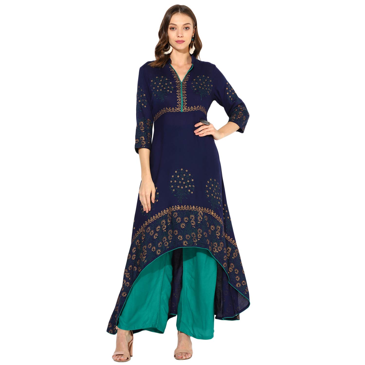 Zoeyam S Women Navy Blue Rayon Block Prints A Line Anarkali Kurti With Rama Green Rayon Palazzo Sets